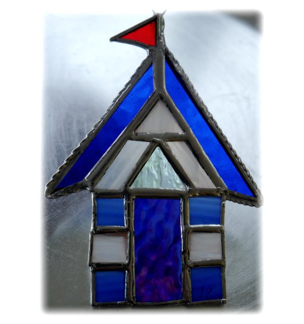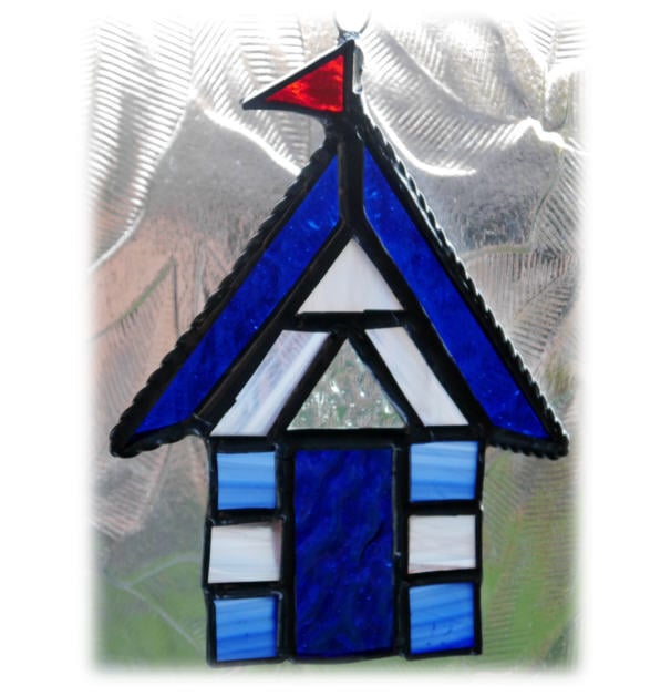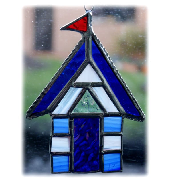 I've made this from 3 types of bright blue glass and some streaky white and I've added a little triangular window above the door in clear iridescent textured glass.