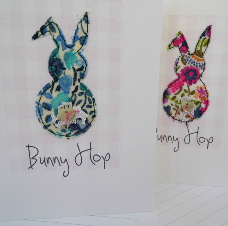 these bunnies are in blue or floral brights with the wording bunny hop please let me know which colour you want