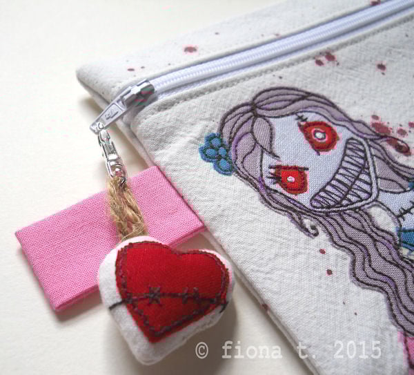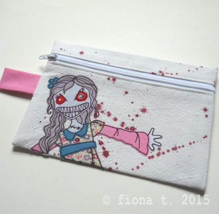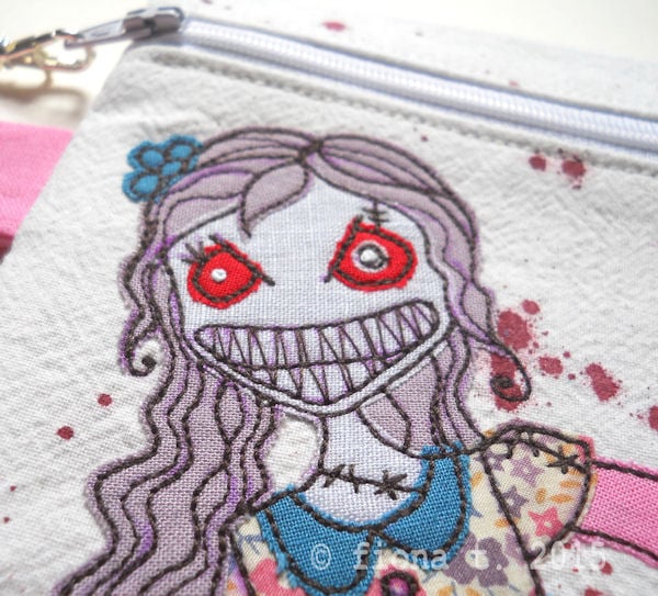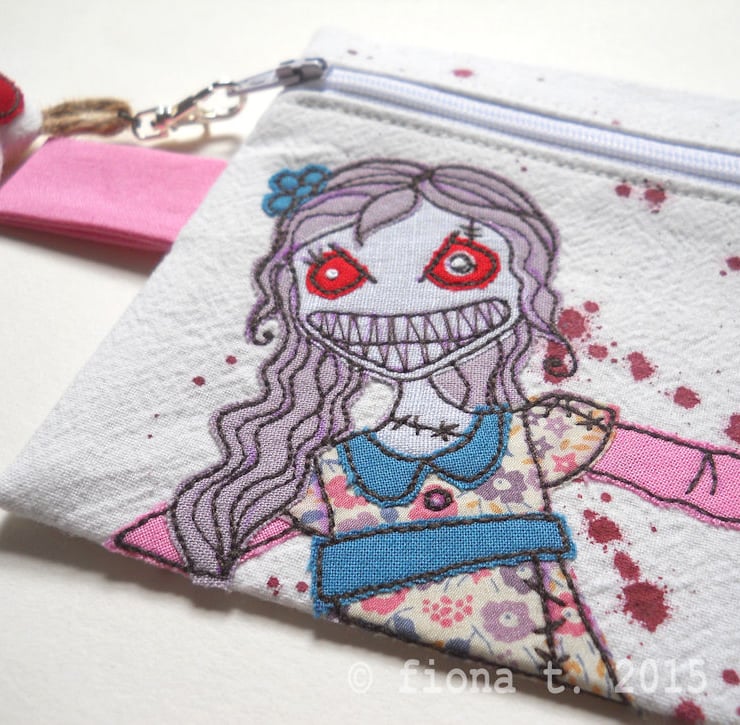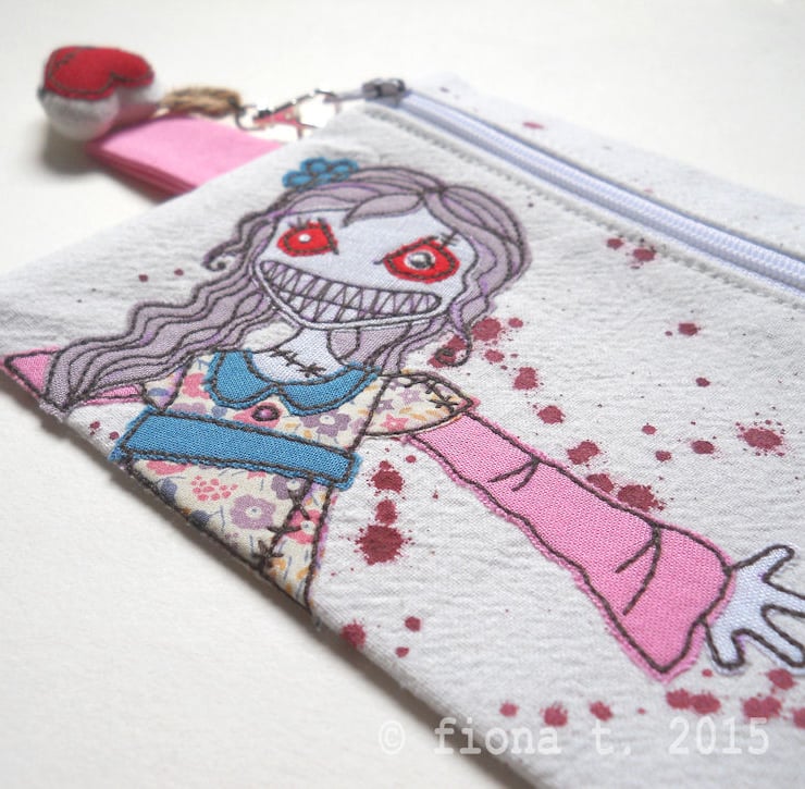 the lilac haired zombie is in a pretty liberty print fabric dress, with turquoise cotton detail to the bodice.