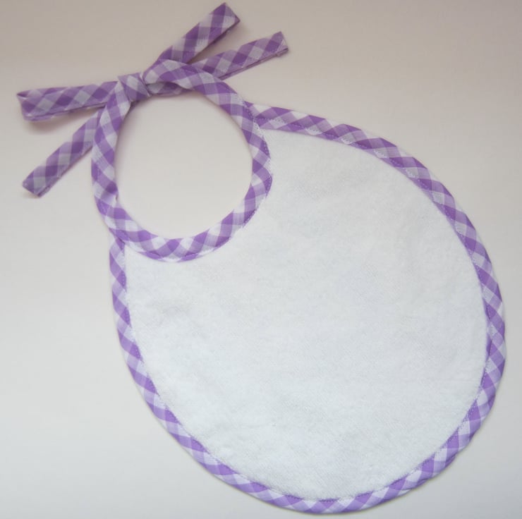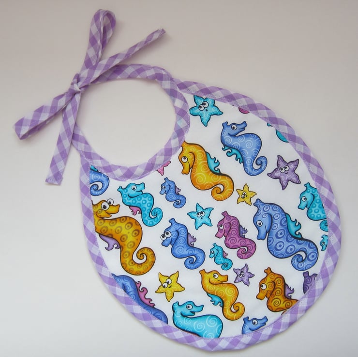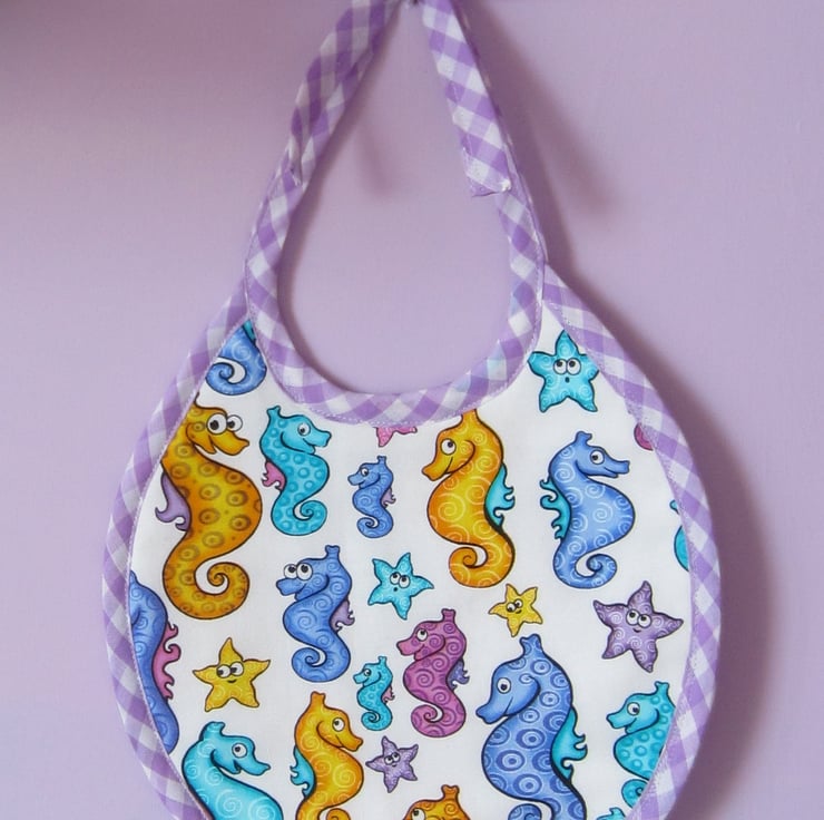 First size babies bib in seahorse fabric, edged with lilac gingham and backed with a lovely soft white velour towelling. It measures 24 cm long and 20.5 cm wide. Suitable for newborn to babies aged about 6 months. Fastens with a bow at the back of the neck.