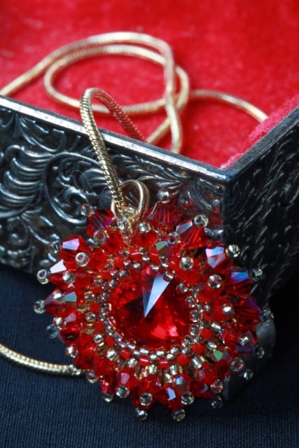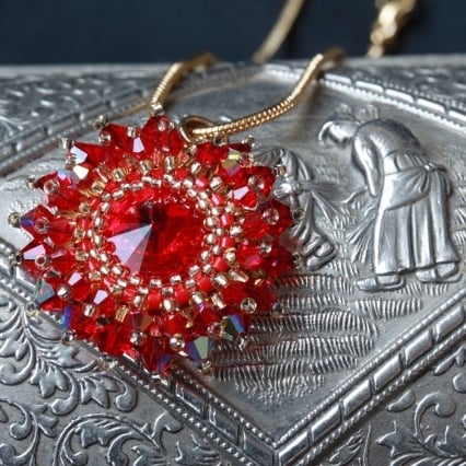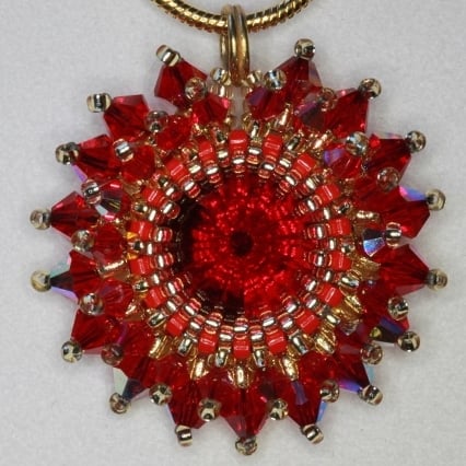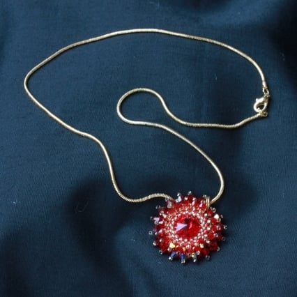 This little pendant is not much more than an inch in diameter. So it is ideal for anyone who doesn’t like big pieces of jewellery. Yet it is full of sparkle. No less than 35 tiny (3mm and 4mm) red Swarovski bicone crystals are stitched around a matching pretty Swarovski rivoli. Each bicone crystal has an AB coating, meaning that one side has been covered with a thin metallic coating. This gives the crystals a lovely iridescent shimmer. The crystals are stitiched in two layers for a starburst effect. The rivoli makes a striking centerpiece as its pointed shape, front and back, gives it depths in which the gold of the tiny surround of seed beads is reflected. The piece is strung on a gold plated snake chain. This could be exchanged for a longer chain at a small extra cost if required although, depending on the length you require, this could delay me sending you the piece for a few days. The colour of the crystals is known as Light Siam.