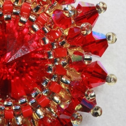 After a few false starts I learned to stitch around rivolis from the excellent tutorial from Deborah Roberti at ‘Around the Beading Table’. Once this was mastered it was just a case of being creative and adding embellishments. I love this starburst effect and have tried it with several different colours.
