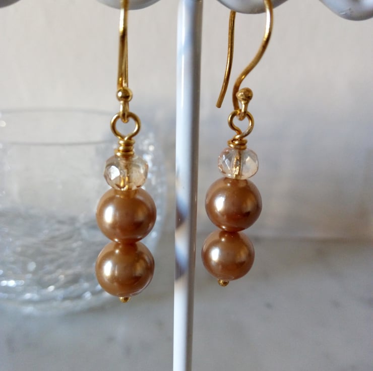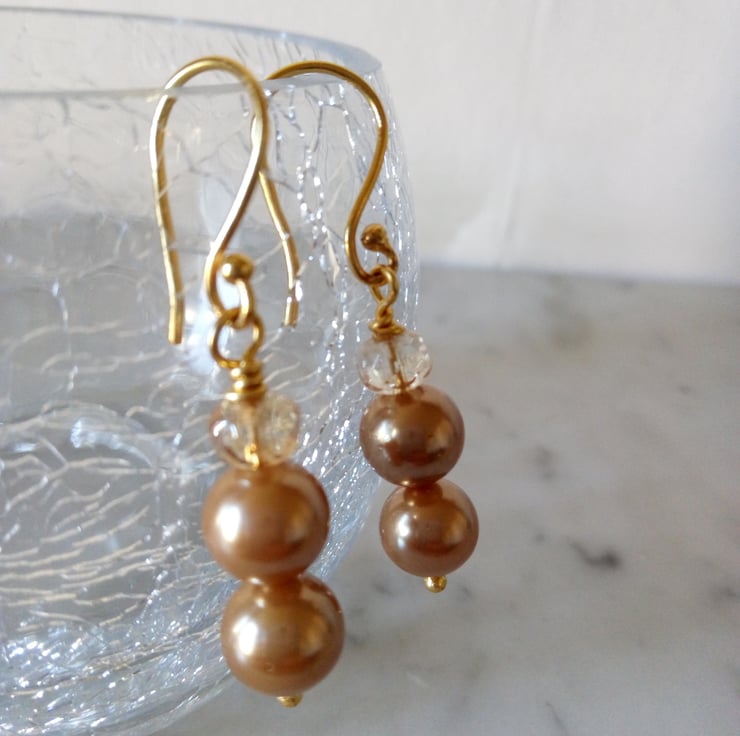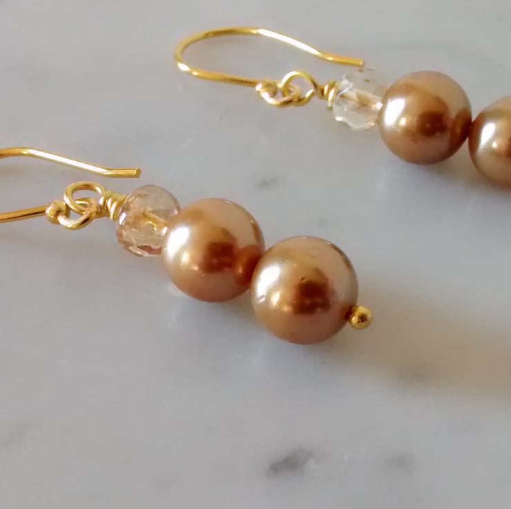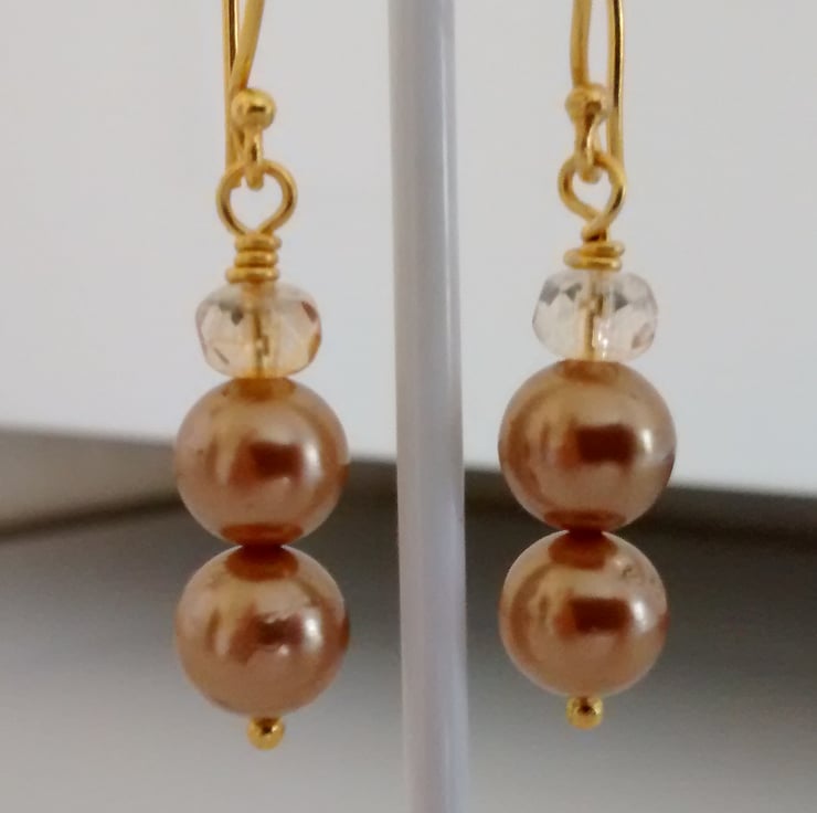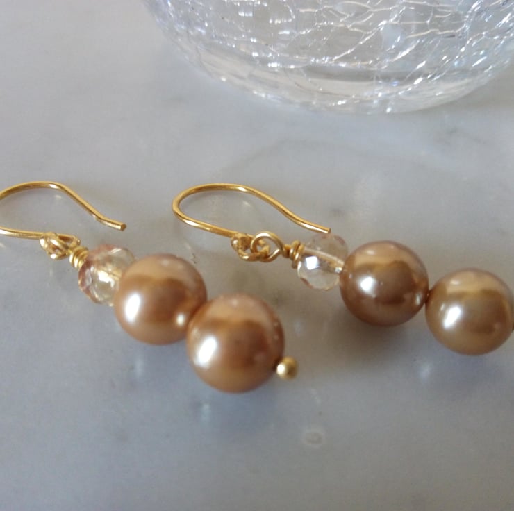 This is a lovely pair of Gold Shell Pearl and Champagne Crystal Dangle Earrings.