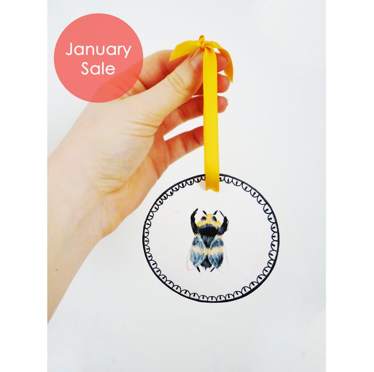 Hand painted bumble bee decoration measuring 7.5cm across. The decoration is coated in several layers of hard-wearing varnish and features a painted bee on either side.
