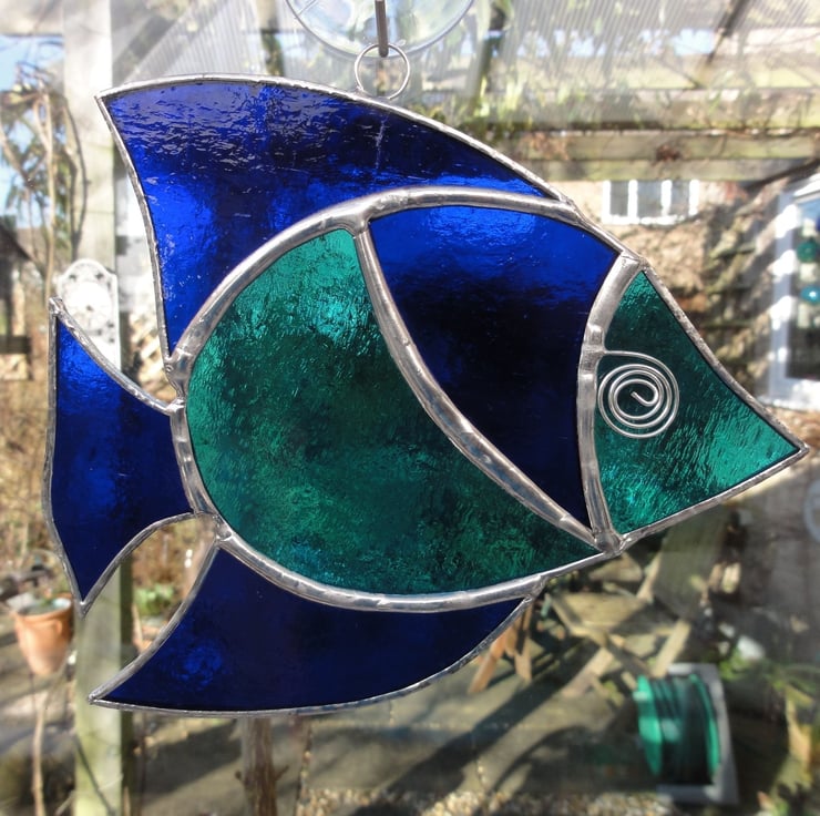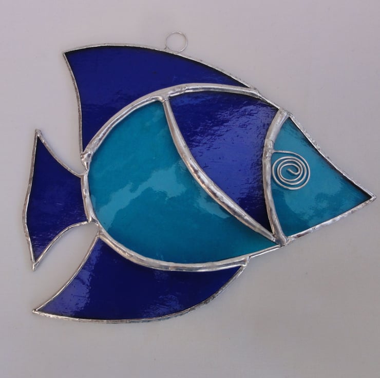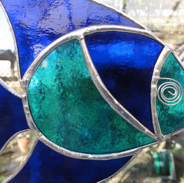 This fish has been made from a mixture of blue glass: cobalt blue restoration glass, and turquoise wissmach glass. Each piece of glass has been copper foiled and soldered with a generous bead on the joints for added strength.