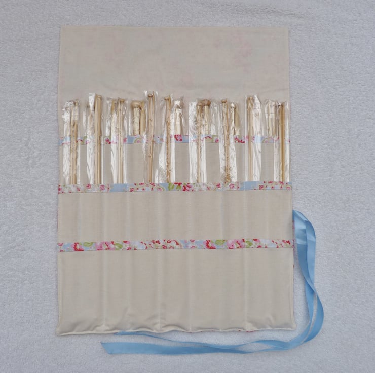 The top of the case is a flap which folds over to keep the needles safe. Once rolled up, there is a blue satin ribbon to secure the holder. It is top stitched to achieve a professional finish. Total size when placed out flat is 15" x 19.5".