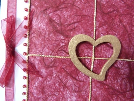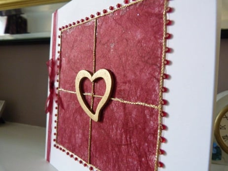 A completely hand made and uniquely designed card. Consisting of a square of dark red mulberry silk paper which has been made into a window with gold cord. A gold wooden heart embellishes the centre. The edges of the square is surrounded by dark red glass beads. Finished off with dark red organza ribbon and bow.