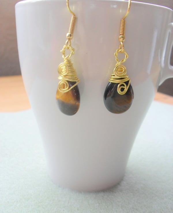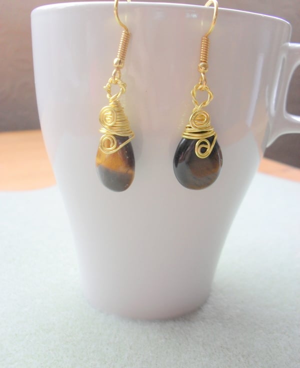 Tigers eye semi precious gemstones are attached to gold plated copper ear wires with gold plated copper wire with a swirl pattern to add some decoration.