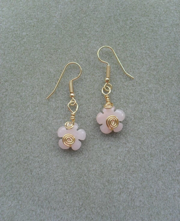 SALE was £4.50 now £2.50 Pale peach quartzite semi precious gemstones flowers are attached to gold plated copper ear wires with gold plated copper wire with a swirl pattern to add some decoration.