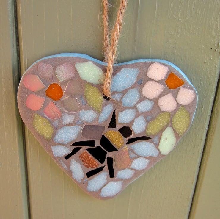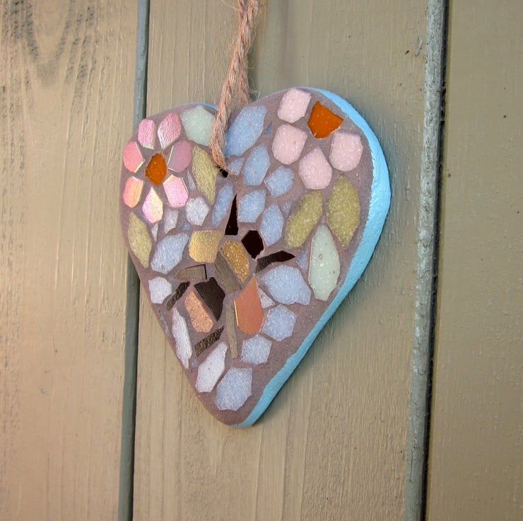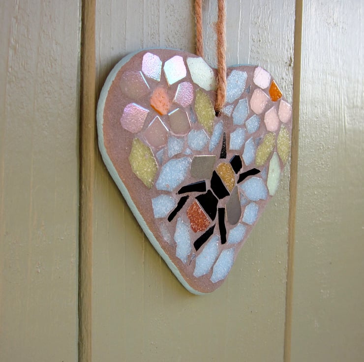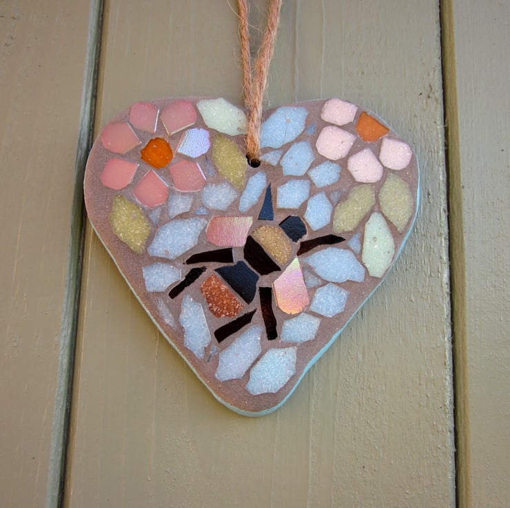 This mosaic decoration can be used in the garden or the home and features a mosaic design with a bumblebee and pink blossom. The blossom flower on the top left, and the bumblebee's wings are made with iridescent tiles to give some added metallic shine interest. The edges of the design are hand painted with a sky blue that matches the tiles used in the design adding to the spring sky feel.
