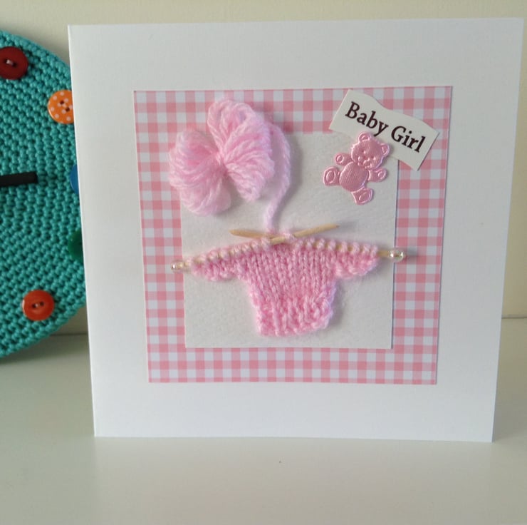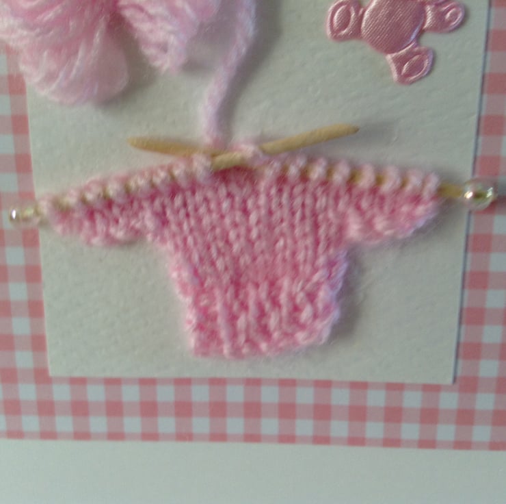 This card for a new baby girl features a cute jumper which I have hand knitted in pink acrylic yarn on handmade miniature knitting needles.