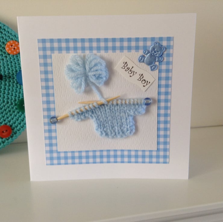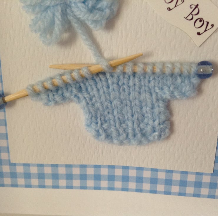 This card for a new baby boy features a cute jumper which I have hand knitted in blue acrylic yarn on handmade miniature knitting needles.
