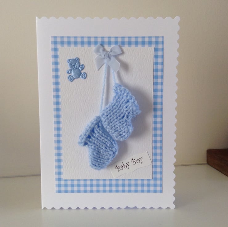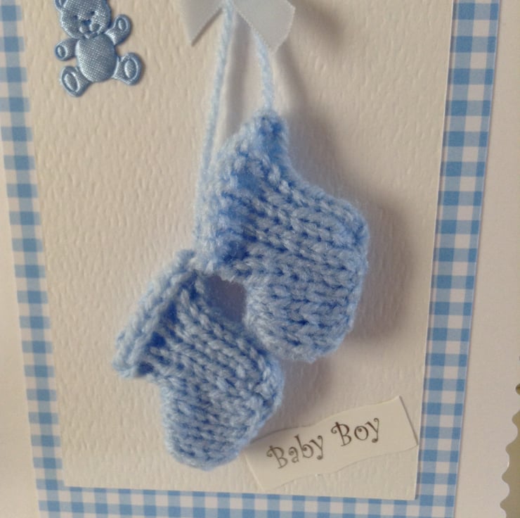 Card for a new baby boy features a cute pair of booties which I have hand knitted in blue acrylic and are hanging from a blue ribbon bow.