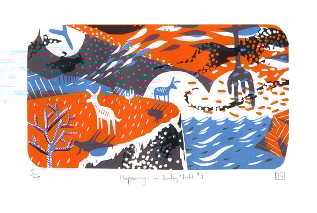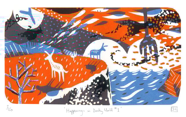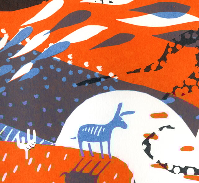 A continuation of my donkey theme for this print, but perhaps a little more loose and abstract in places. I decided to try and create a secret world that only donkeys know about, and it turned out like this! The print is also a rarity for me, being in landscape orientation (rather than portrait).