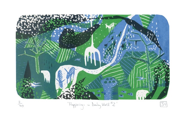 This is a hand-pulled screen print entitled 'Happenings in Donkey World No.2' printed in blue, green and dark grey.