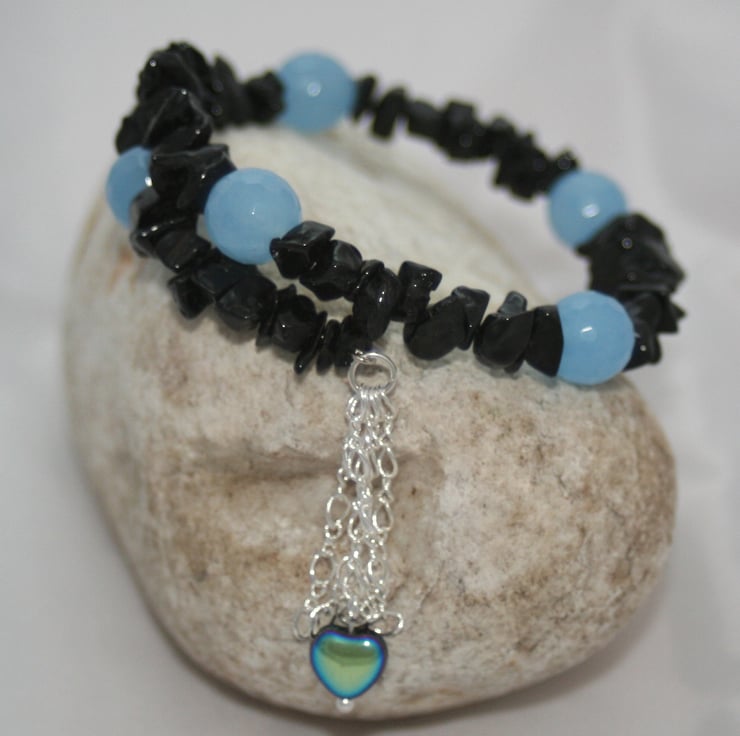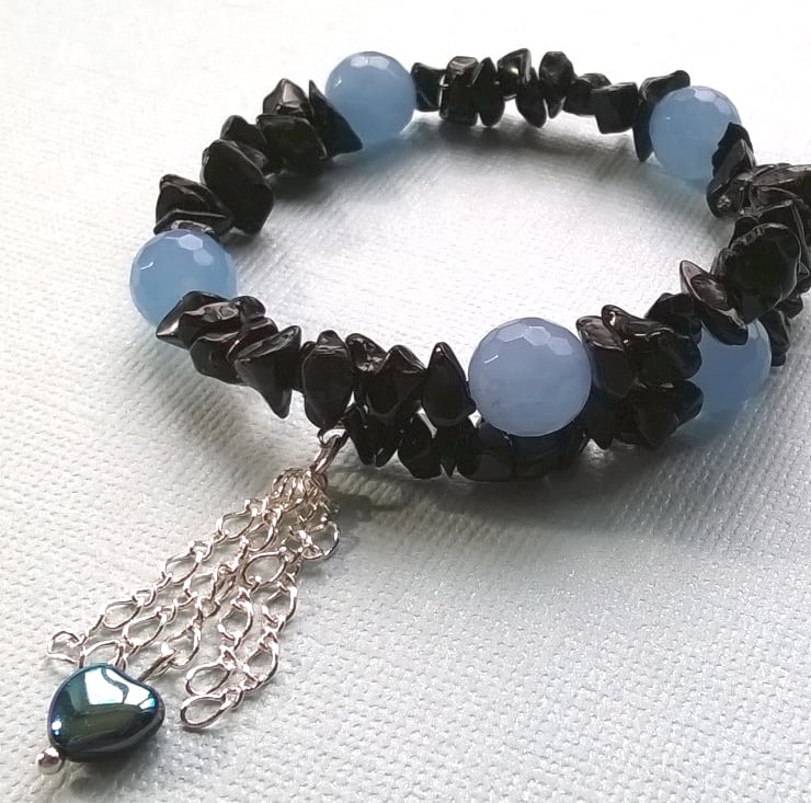 This bracelet is made with black tourmaline and faceted, round light blue quartz strung onto just over one coil of memory wire. One end is finished with a sparkly silver bead and the other with a silver plated chain tassel and shiny blue heart.
