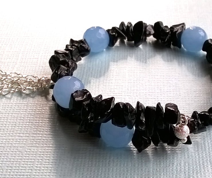 The light blue quartz really pops against the shiny jet black black tourmaline. This bracelet is incredibly easy and attractive to wear.