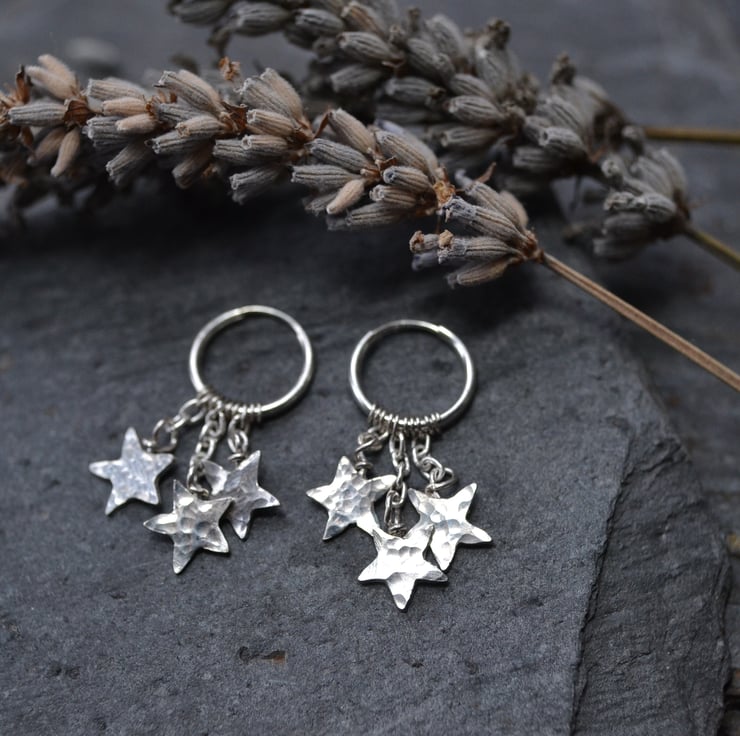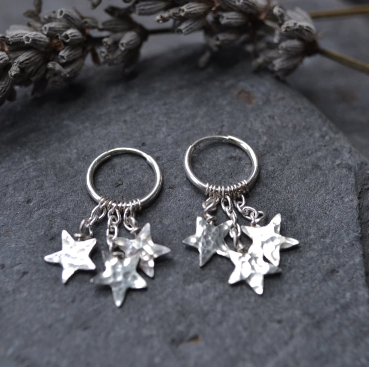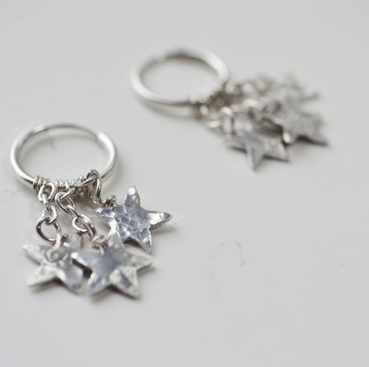 Silver star hoop earrings. Each fine silver star is handmade, hammered and attached to a sterling silver sleeper hoop by a sterling chain.