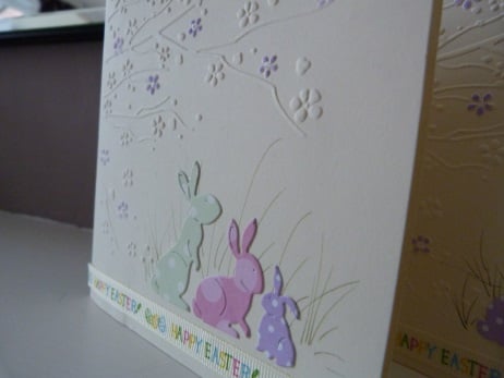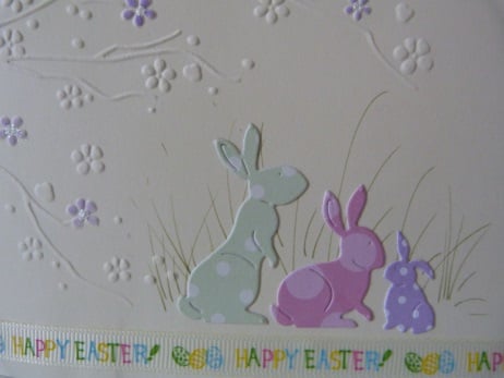 A completely handmade and uniquely designed pack of 4 cards. The only variation is the colourway of each rabbit but all in pastel shades. Consisting of cream card which has a flowery branch embossed and random flowers hand coloured in lilac with glitter centres. A family of rabbits , daddy, mummy and baby die cut from pastel spotted card has been mounted and surrounded by hand drawn grass. Finished off with Happy Easter ribbon.