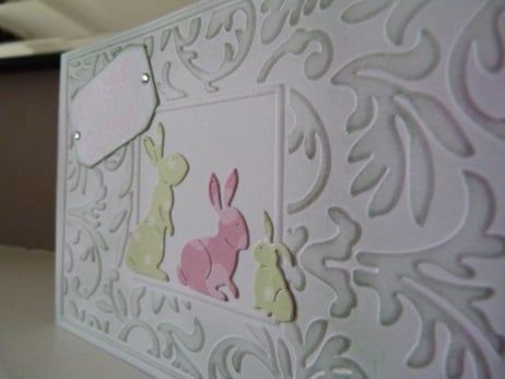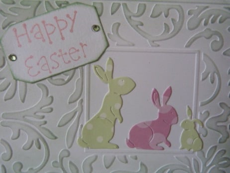 A pack of 4 cards completely hand made and individually designed. All cards are the same with variation in individual colours of the rabbits but all either pale green or pale pink. Quality white card has had a swirly design embossed and coloured by hand in pale green. A cute family of bunny rabbits consisting of daddy, mummy and baby rabbit die cut from dotty card. Finished off with a Happy Easter tag decorated with pale green rhinestones.