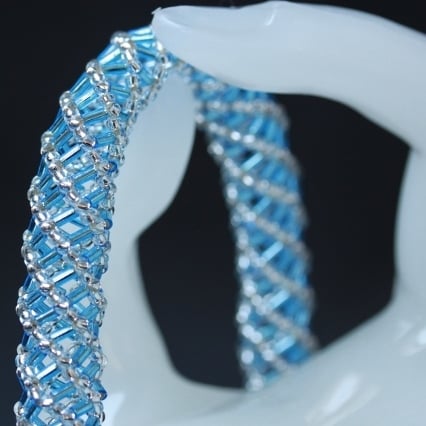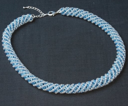 This pretty spiral rope necklace is handwoven using tiny silver-lined seed beads and bugle beads in a shiny pale blue. Its hollow structure gives the piece a very delicate appearance. Although it is a little less robust than some of my other necklaces it is stitched using the strongest tensile strength of Fireline braided beading thread and will withstand normal use. It is finished with a plated silver clasp and extension chain with a tiny silver-coloured droplet. The extension chain adds a pretty extra feature at the back if the wearer has short hair or is wearing their hair up.