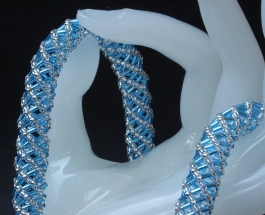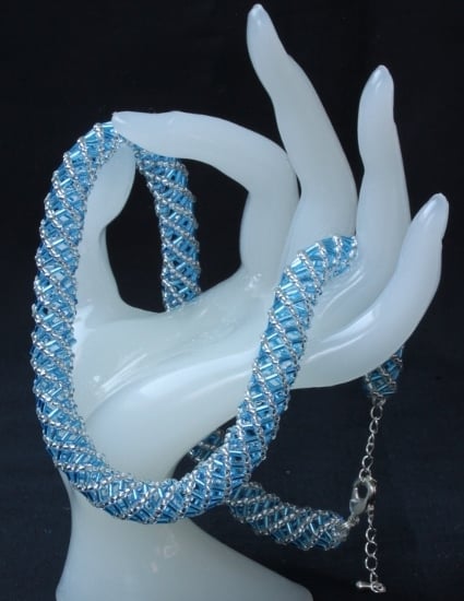 The stitch used in this necklace is called Russian Spiral. It is a stitch I only discovered recently and I am amazed at the variations that can be made just by changing the types of beads and the number in each round. These shiny blue bugle beads are a favourite of mine and this was the first time I tried the spiral with just bugle beads between the small seed beads. I love the open effect it has; quite different to some of the other examples of Russian Spiral that I am selling.