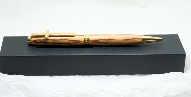 This pen was handturned by me in my workshop in suffolk, the metal parts are gold finish, Included in the price is a black card presentation box