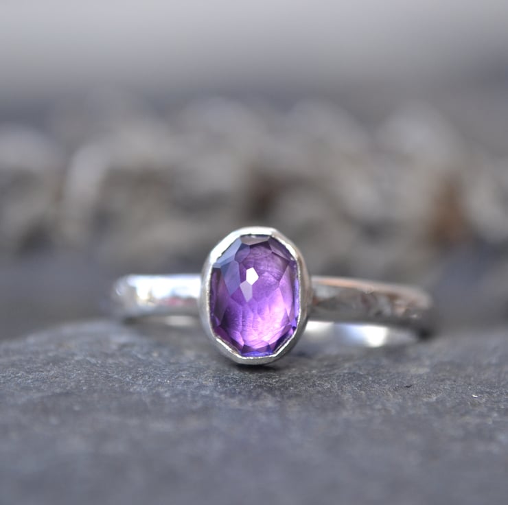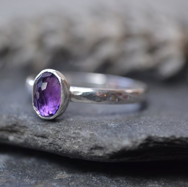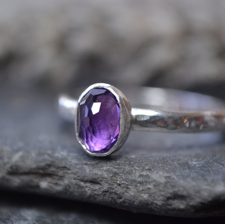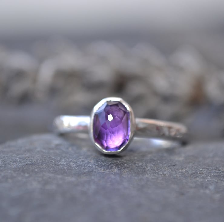 A gorgeous oval 7x5mm faceted amethys cabochon set on a sterling silver 2.3mm wide band.