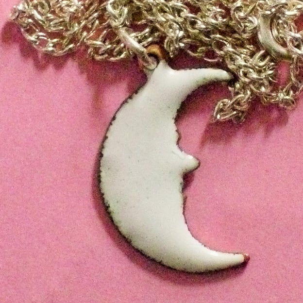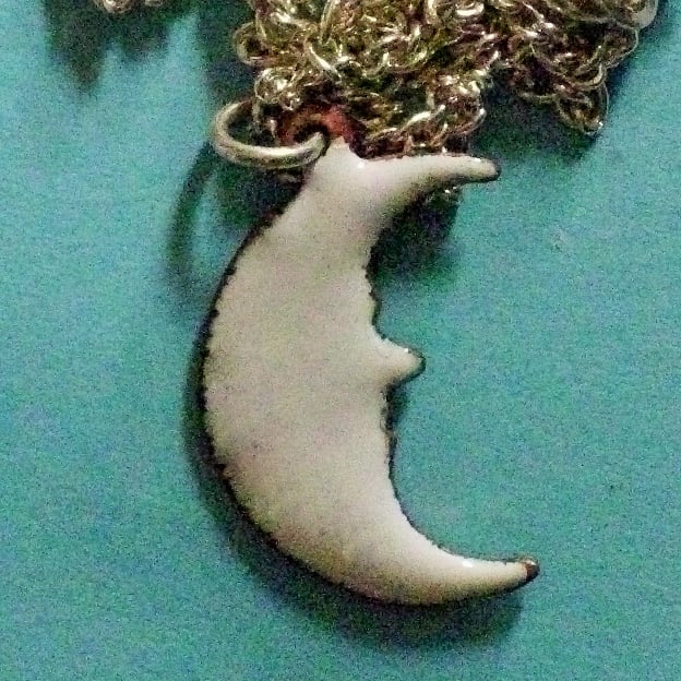 The half-moon is 20mm tall, 13mm at its widest. It is counter enamelled. It is mounted on silver plate 45cm (18 inch) curb chain fastened with a simple bolt ring.