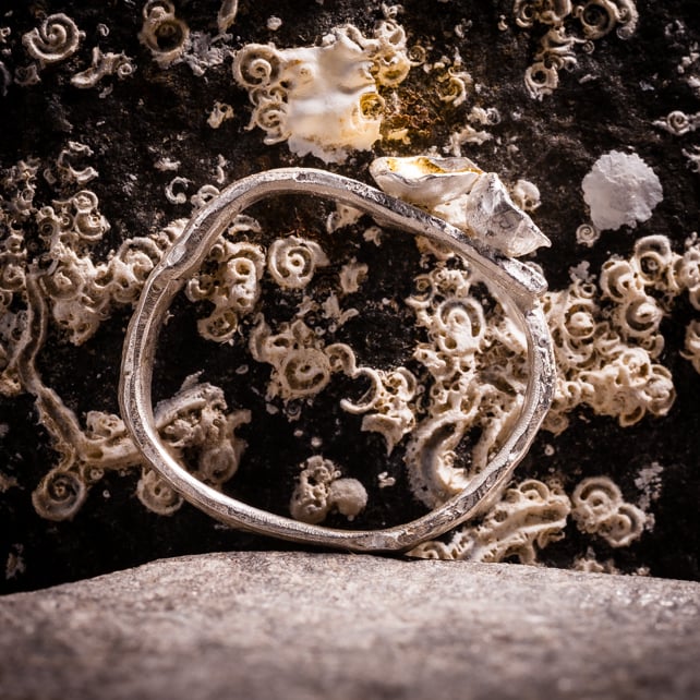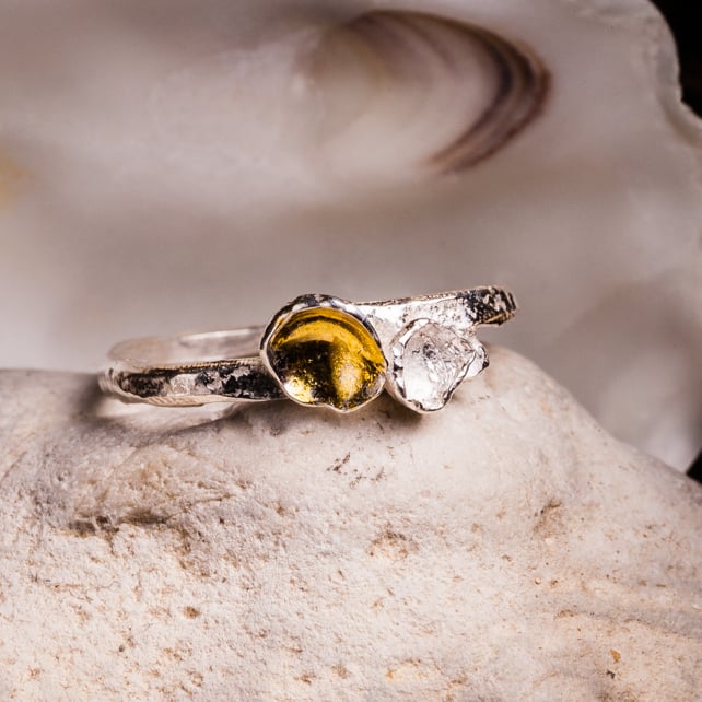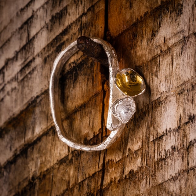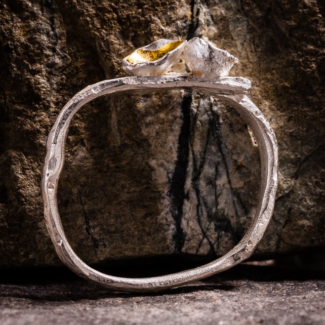 organic eco silver ring with 23.5c gold highlighted cupped pebble.