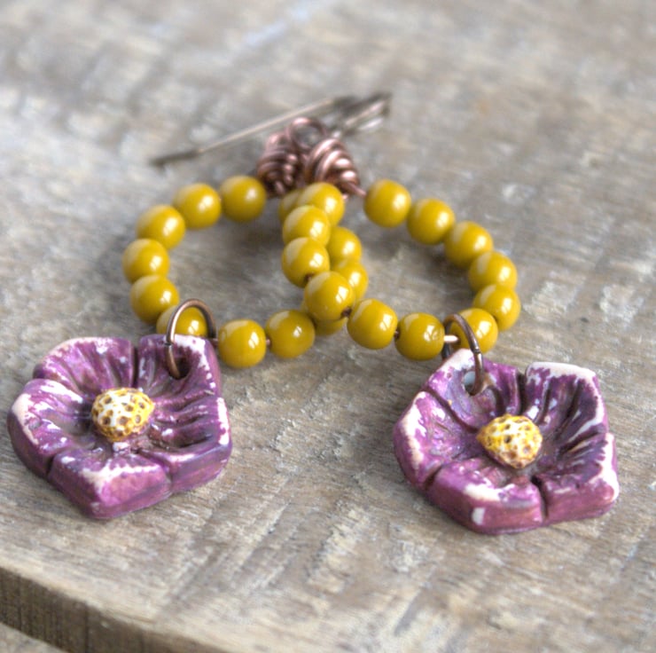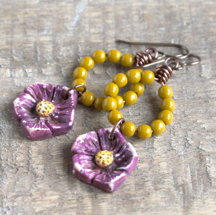 Petals - Rustic Beaded Earrings with Artisan Polymer Clay Flower Charms