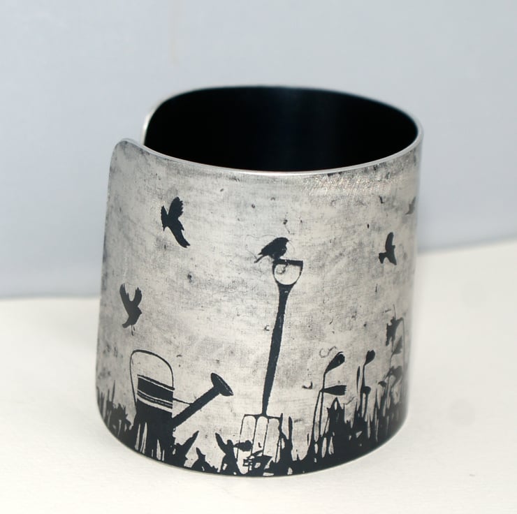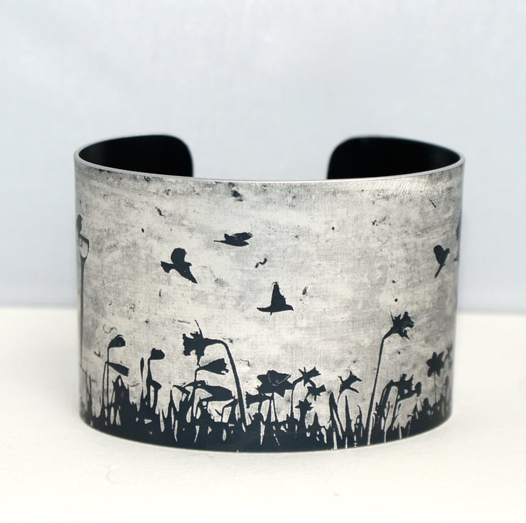 A hand dyed aluminium cuff featuring a silhouette of lots of lovely things you might find in your garden including daffodils and birds. The design originates from my own photographs which I layer and edit with additional illustrations until I have a black and white image. This is then used as a resist when dyeing the cuff and leaves the design in the silver colour of the metal. Please note your cuff may vary very slightly from the image. This design can be made in any colour you see in my shop, please just let me know what you would like!