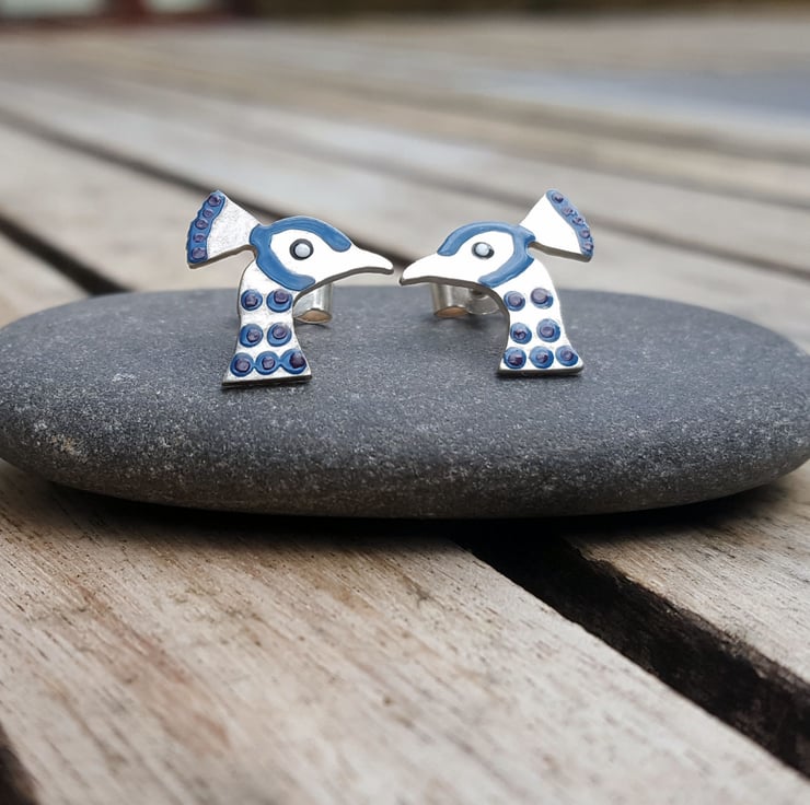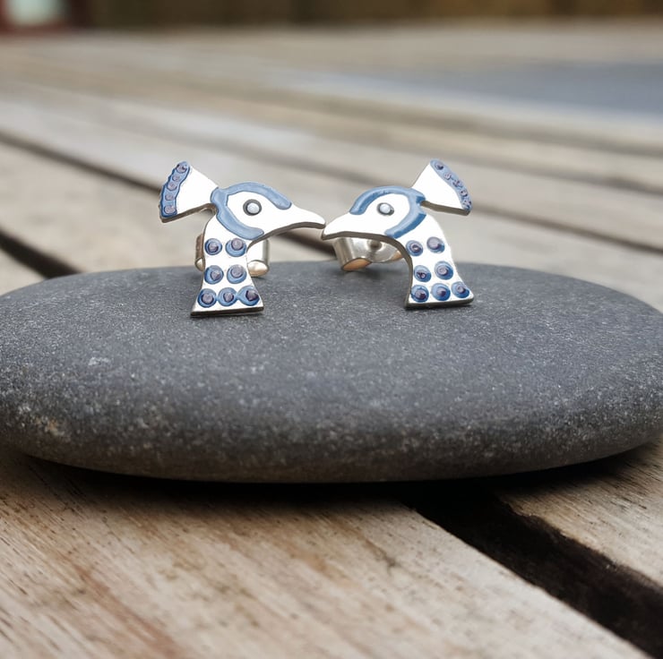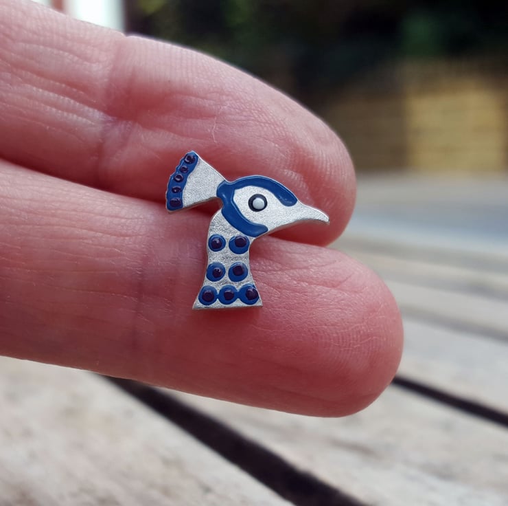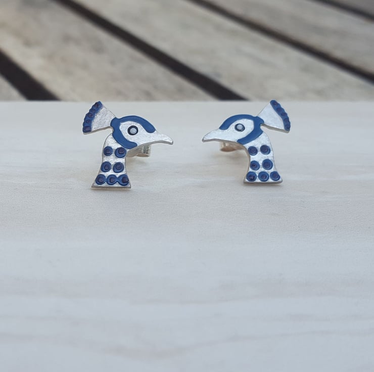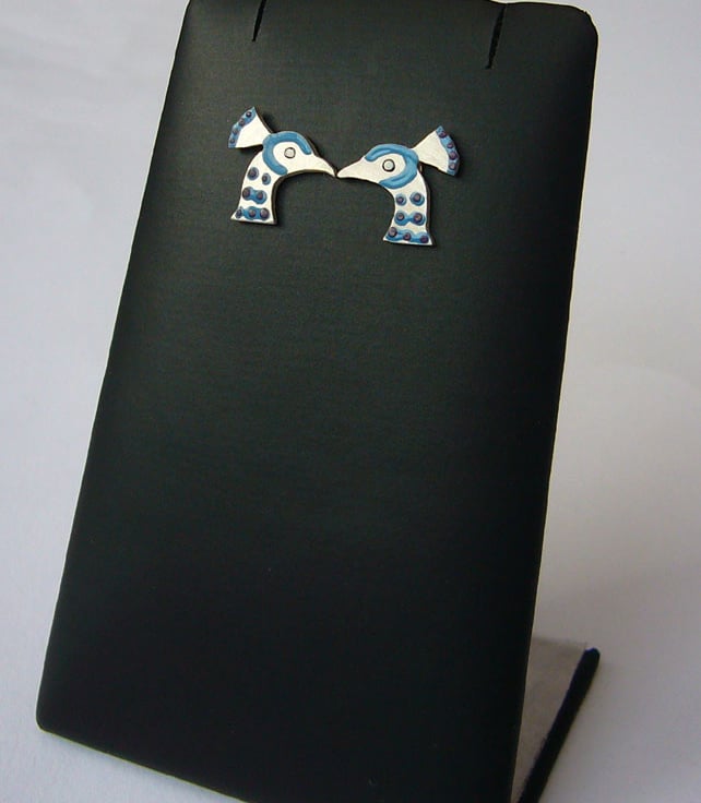 These are simple, peacock heads, hand cut out of 1mm thick sterling silver. They are approximately 1.4cm wide and high and are painted on with enamel paint. Sterling silver ear pins are soldered to the back.