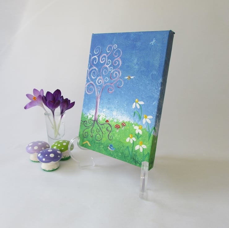 Look closely, can you see the snail and caterpillar in the grass, the dragonfly and bee flying in the blue sky and the ladybird crawling up the tree trunk.