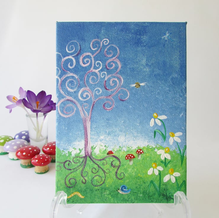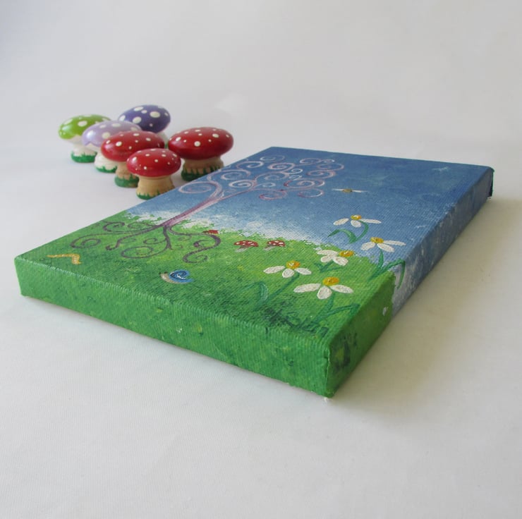 This small canvas has been handpainted with acrylic paints.