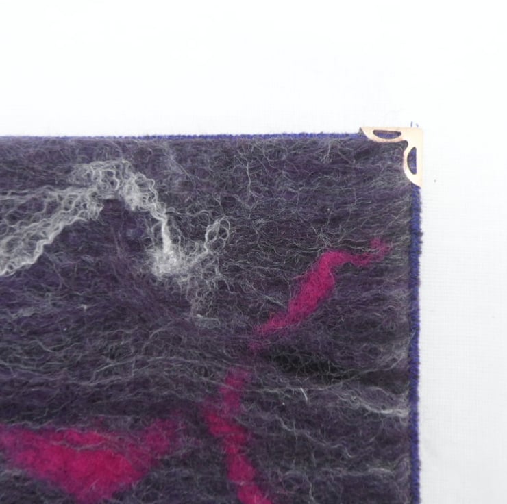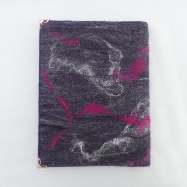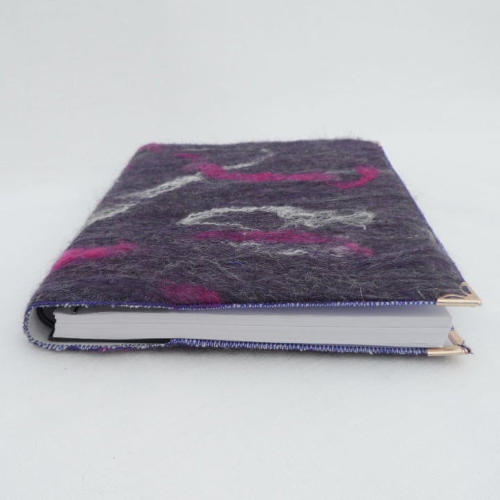 The cover on this notebook is made from handmade felt in purple shades of merino wool with wensleydale curly wool locks and silk fibres added for embellishment. The felt has been bonded to a cotton muslin base fabric, using a nuno felting technique, to give added strength and stability. Heavy weight interfacing has been added to help maintain shape. The insides of the cover have been made using a plain lilac polycotton fabric. Gold coloured corner protectors have been added to increase durability.