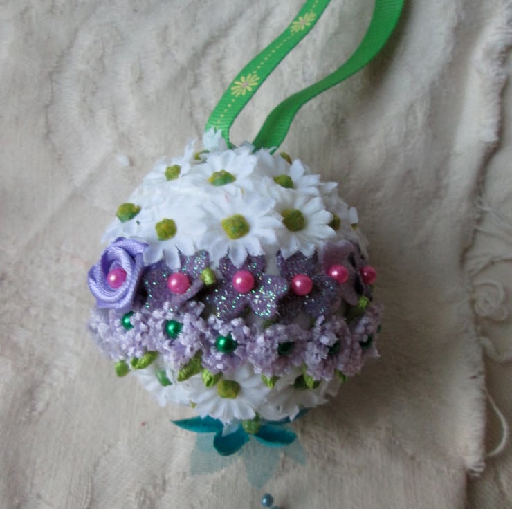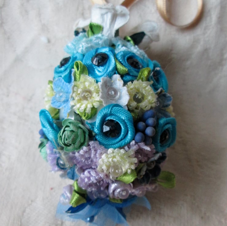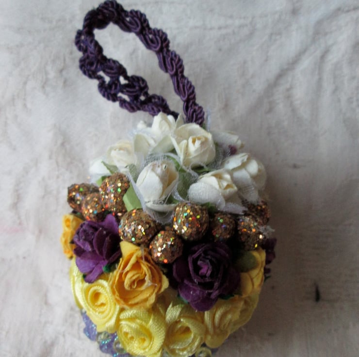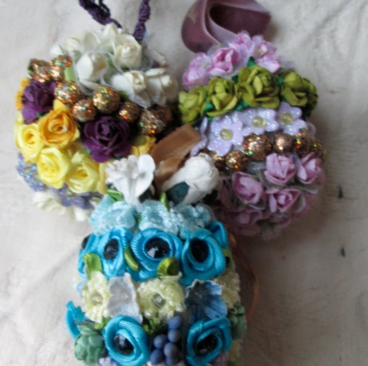 These Easter Egg decorations would look beautiful on an Easter tree or hung in a window.They are made of silk and ribbon flowers adorned with beads sequins and a ribbon to hang them.