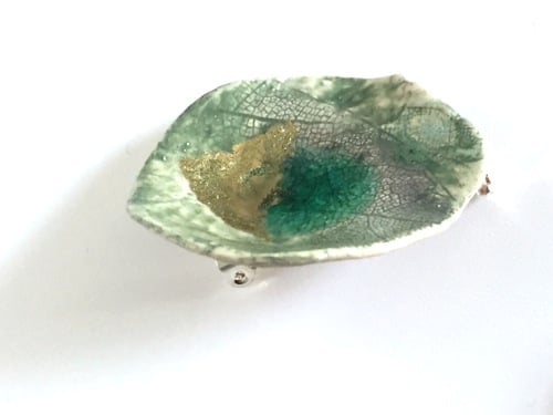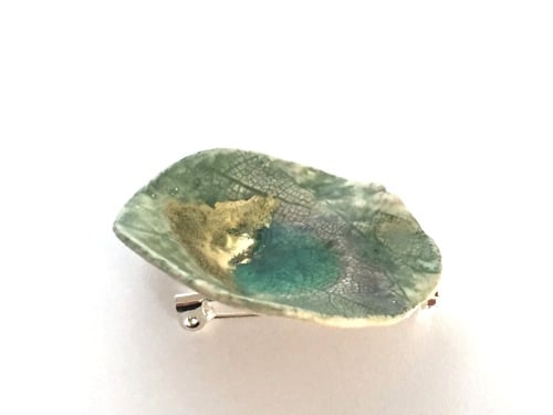 A textural porcelain brooch hand shaped with a leaf design and fired twice with a green glaze and glass.