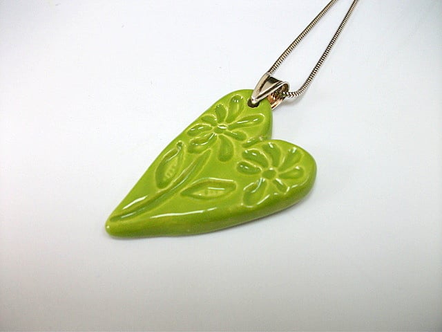 This lovely apple green pendant has been imprinted with a floral design, glazed three times and fired twice, hanging from a sterling silver pronged bail on a sterling silver 16 inch snake chain.