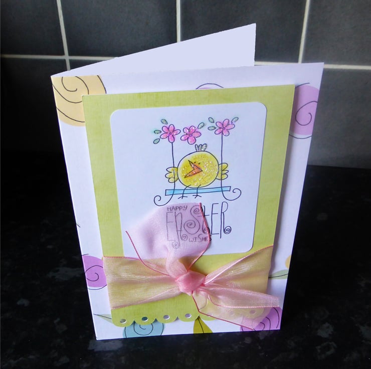 Pretty Easter Card featuring stamped image of Easter Chick on a swing, coloured in and glittered. This is matted onto daffodil yellow card which has a big bow tied round it and is raise-mounted onto a brightly patterned card blank.