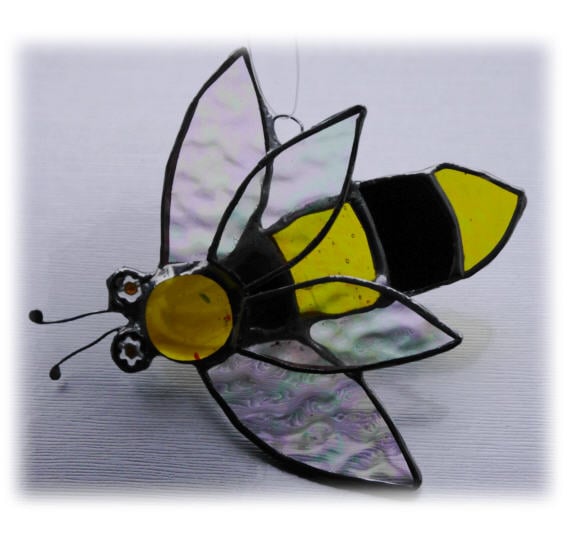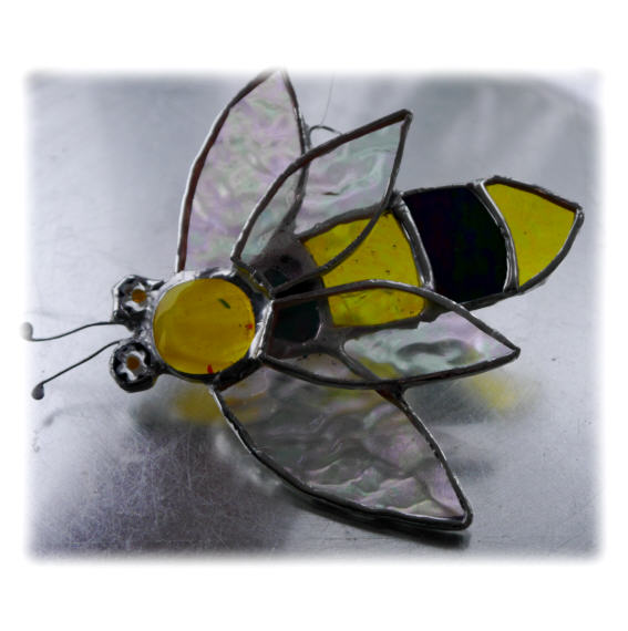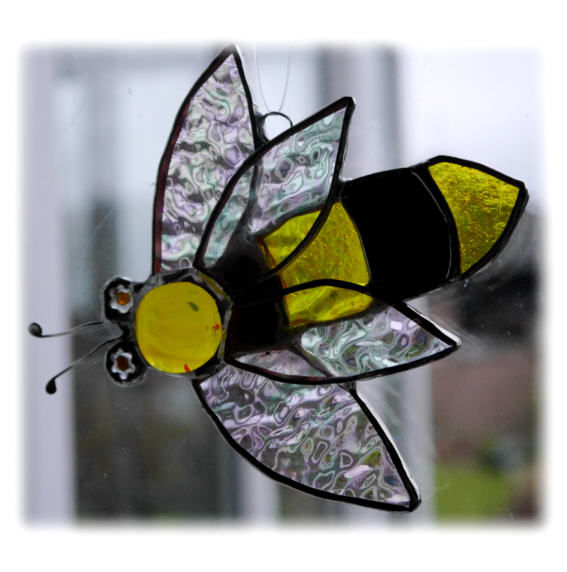 The bee hangs from a strong nylon thread so it looks as if it's flying when hanging in the window.
