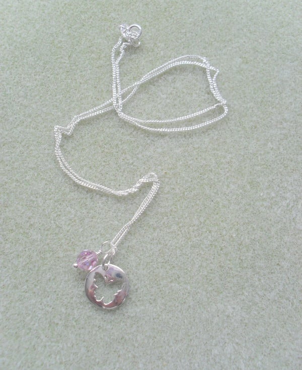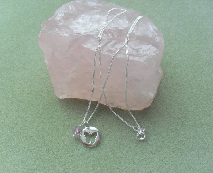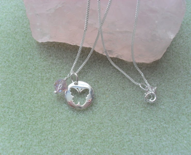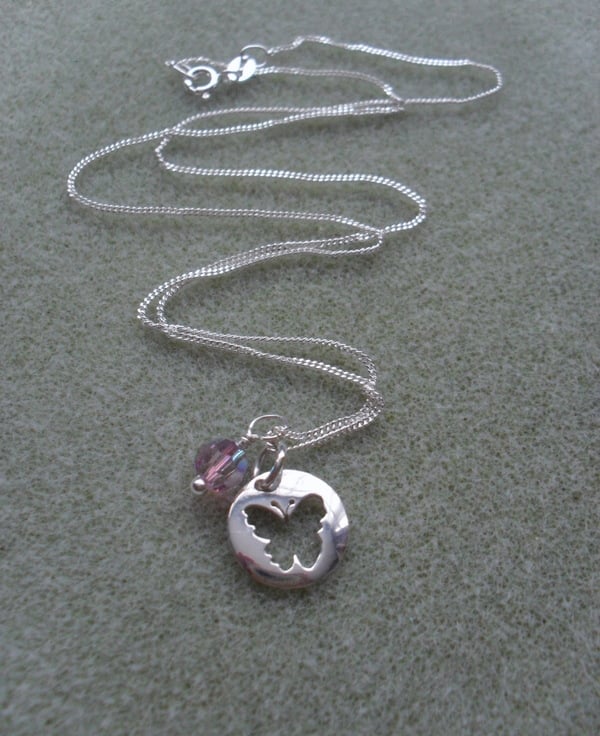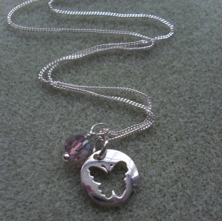 Sterling silver butterfly charm with a Swarovski lilac aurora borealis crystal are attached to a 18 inch sterling silver chain.