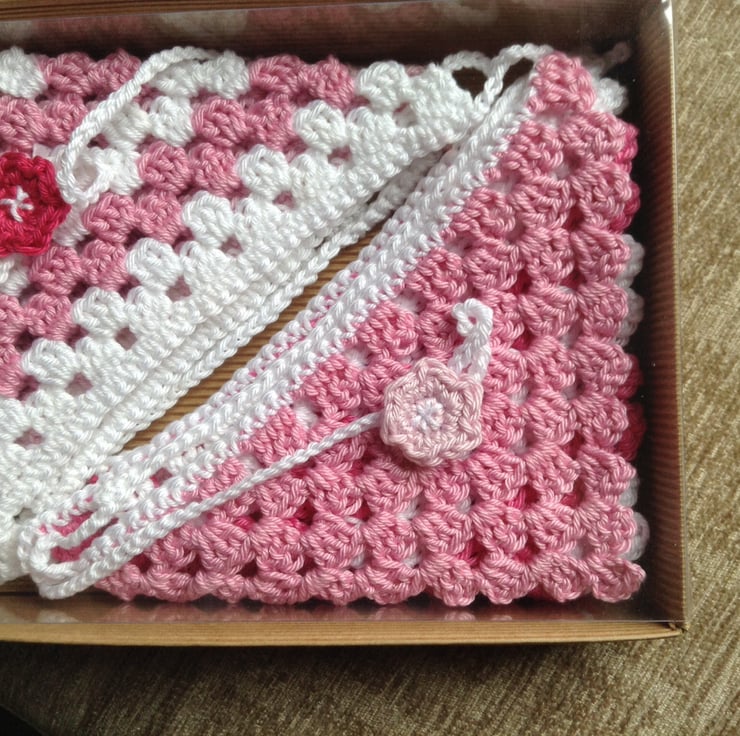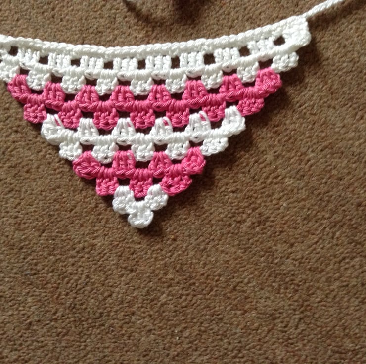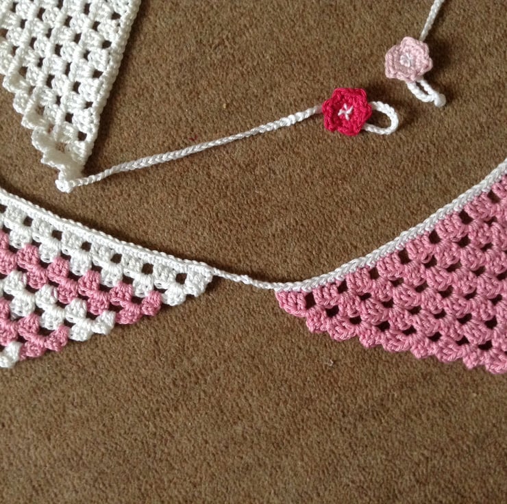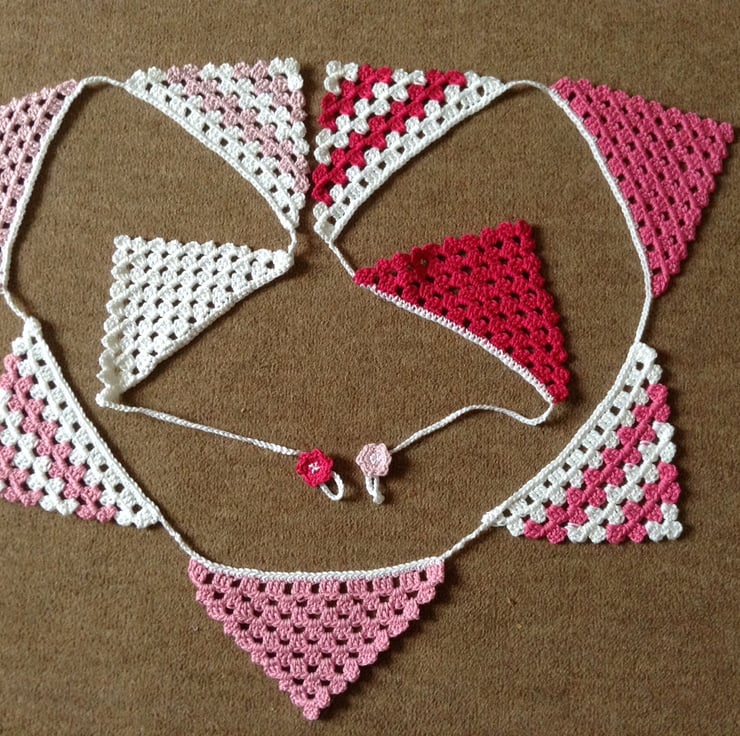 Pretty crocheted bunting in 4 shades of pnk and white mercerised 100% cotton.