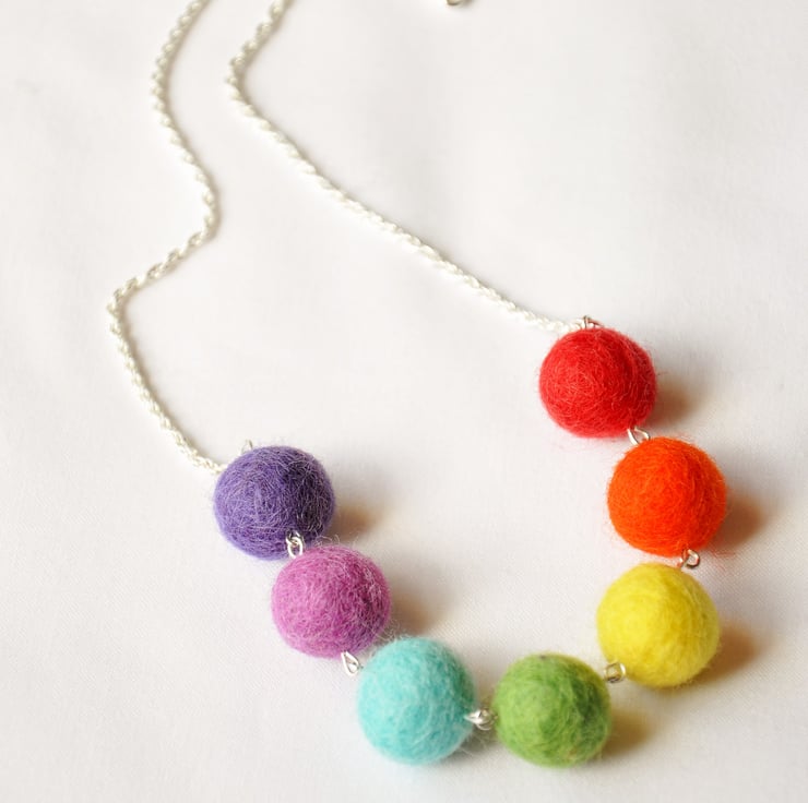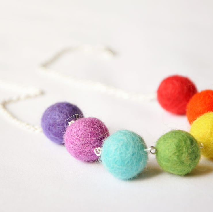 Gorgeous colourful handmade felted wool ball necklace in rainbow colours, finishing off with lush wheat braided silver plated chain. Perfect wear for pride or summer.