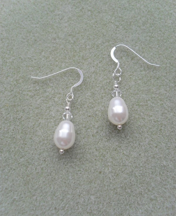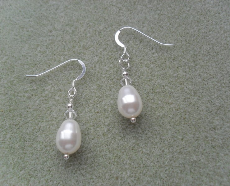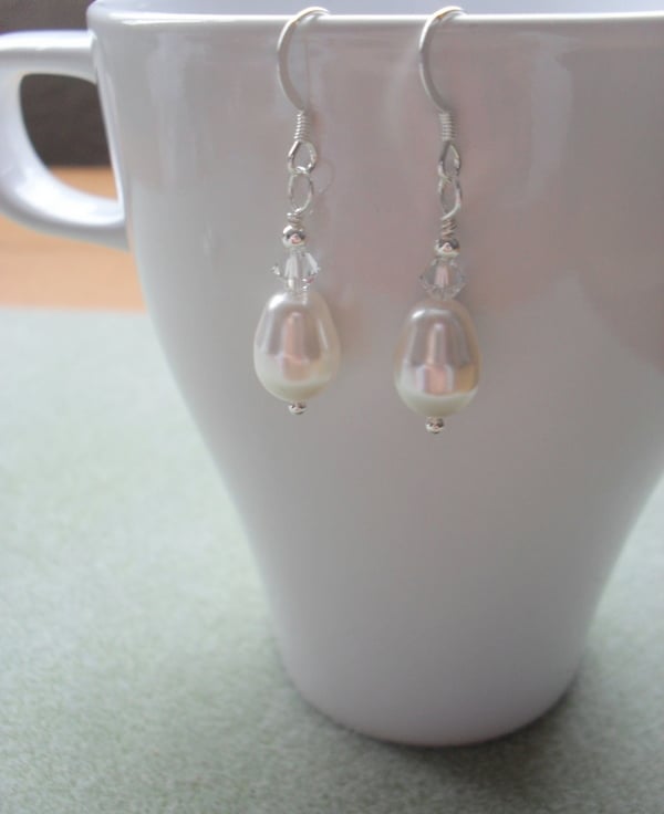 Swarovski drop pearls and crystals are attached to sterling silver ear wires