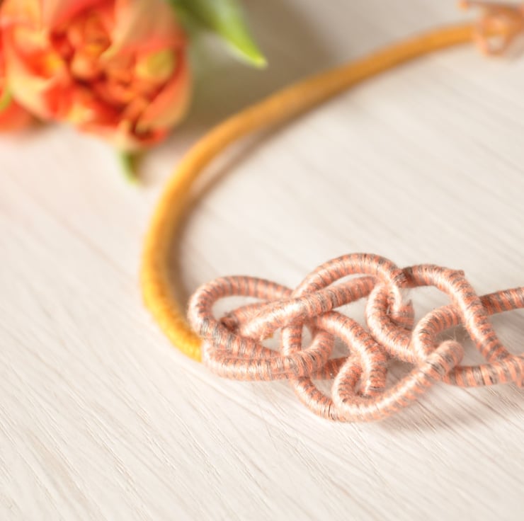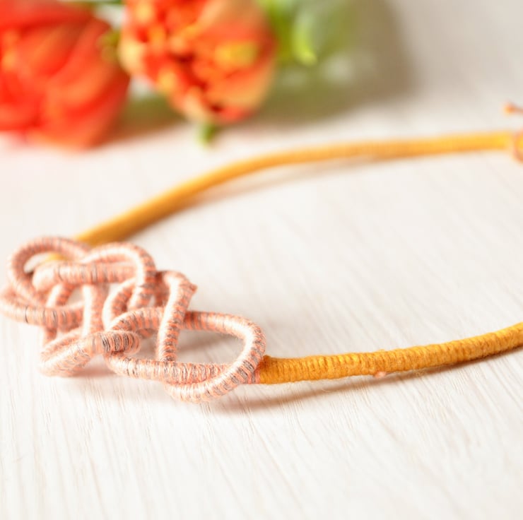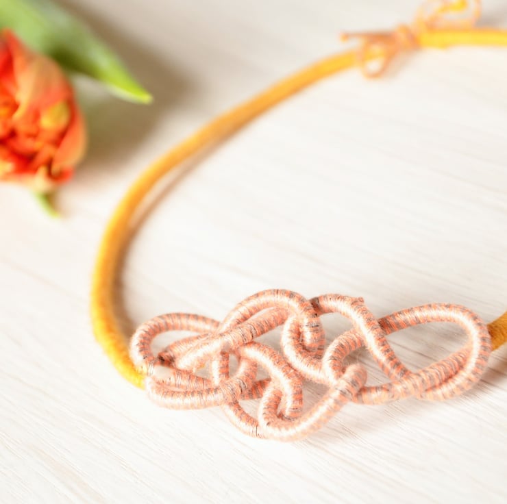 Mustard and blush pink 100%cotton fiber threaded natural, organic choker necklace with unique, unusual knotted front. The whole necklace is very light to wear and natural. I formed all different free form knots on the front, creating an eye catchy choker necklace.