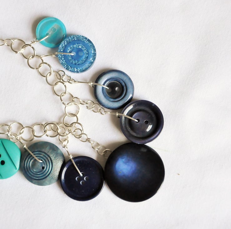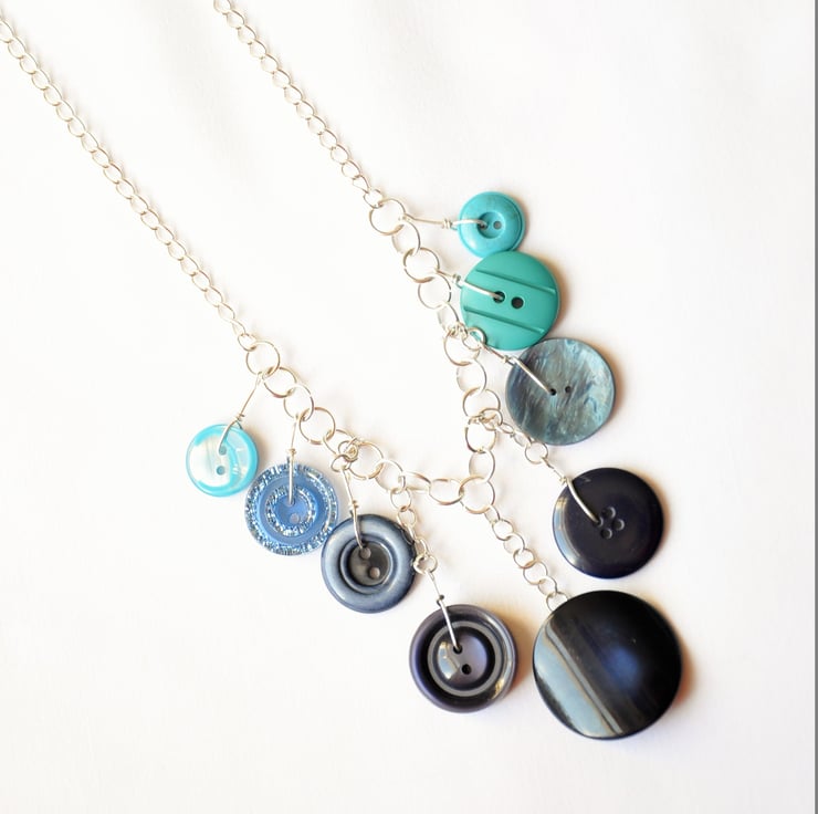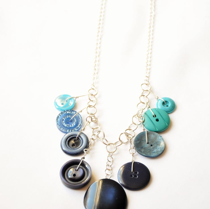 Blue hanging button necklace with silver plated chain. Carefully been picked and made from new and vintage different sized buttons with silver plated findings and chain, as seen on photos. The bottom chunky blue button is very unique and unusual, gives a different shade of blue from different angles. Tried to capture it on the photos, but is impossible:) Very light ans comfortable to wear. Aqua and navy blue statement jewelry for any occasion. Looks perfectly when hang down from your collar bone, as seen on pictures, if you need it any shorter or longer please message me regarding the length you need:) At the moment the length is: 46 cm, 18"