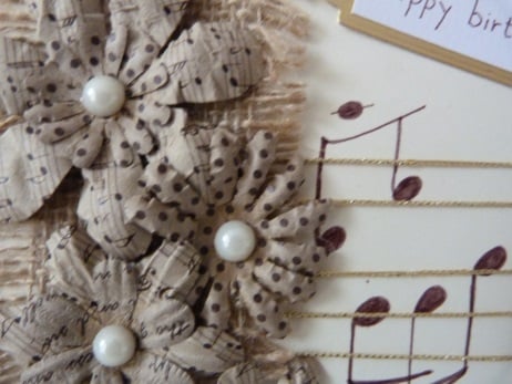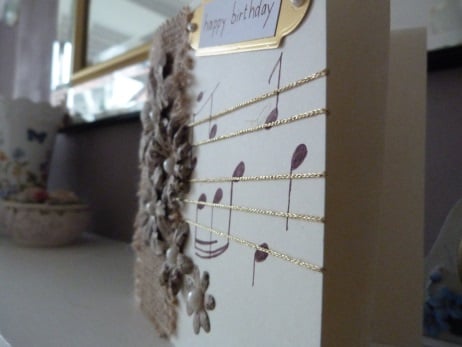 A quality cream card which has a unique design completely handmade with a musical theme. 5 strands of gold thread with musical notes hand drawn in brown ink. A band of hessian which has been embellished with music/dotty pale brown paper cut out flowers. The centres of which have been decorated with pearls. Finished off with a happy birthday tag.