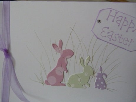 A pack of 4 Easter card, the only variance is the colour of the rabbits but all in pastel shades of pink, pale green and lilac. A unique design, completely hand made consisting of quality pristine white card which has a family of three bunny rabbits, daddy, mummy and baby die cut from pastel dotty card. Grass hand drawn in sage green. Finished off with lilac organza ribbon and Happy Easter tag decorated with silver rhinestones.