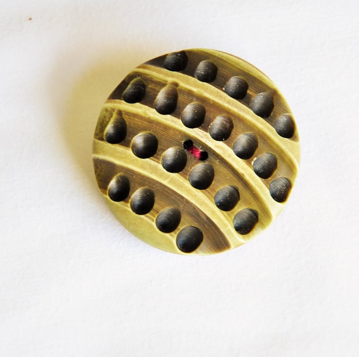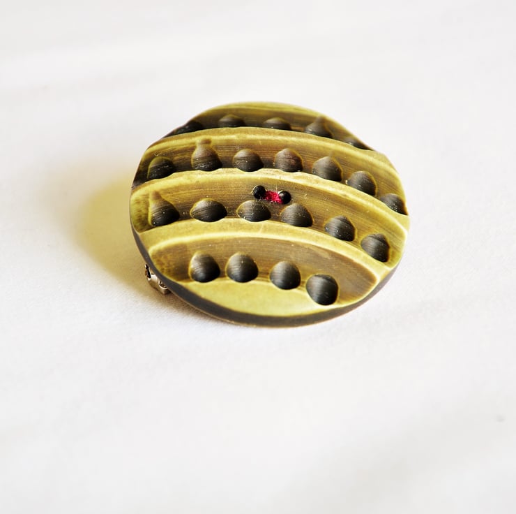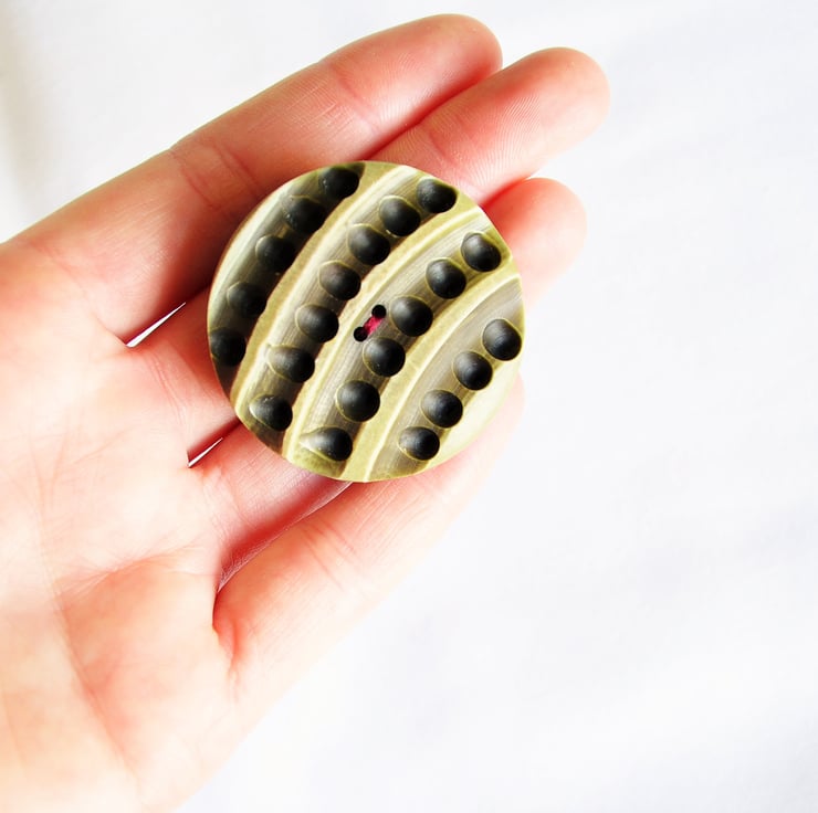 Large green unique button brooch. The giant button is very unusual, never seen anything like this before and is very precious. Has got stripes and tiny holes in between, tried to capture it on the picture, but the pictures doesn't do it justice. it is very large and very cute. Perfect gift for anyone who loves buttons, collect and adore them. They probably have never seen a button like this before. Added a cute red heart at the back to create the perfect cutest gift ever.